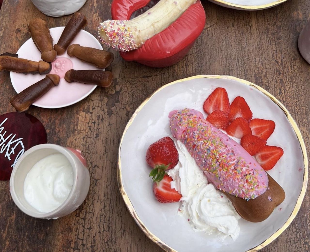 There is a full menu of themed cocktails like Goddess of Sex, No Pain, No Gain, and Nipple Clamps, plus lots of naughty food options like willy-shaped waffles and charcuterie boards.