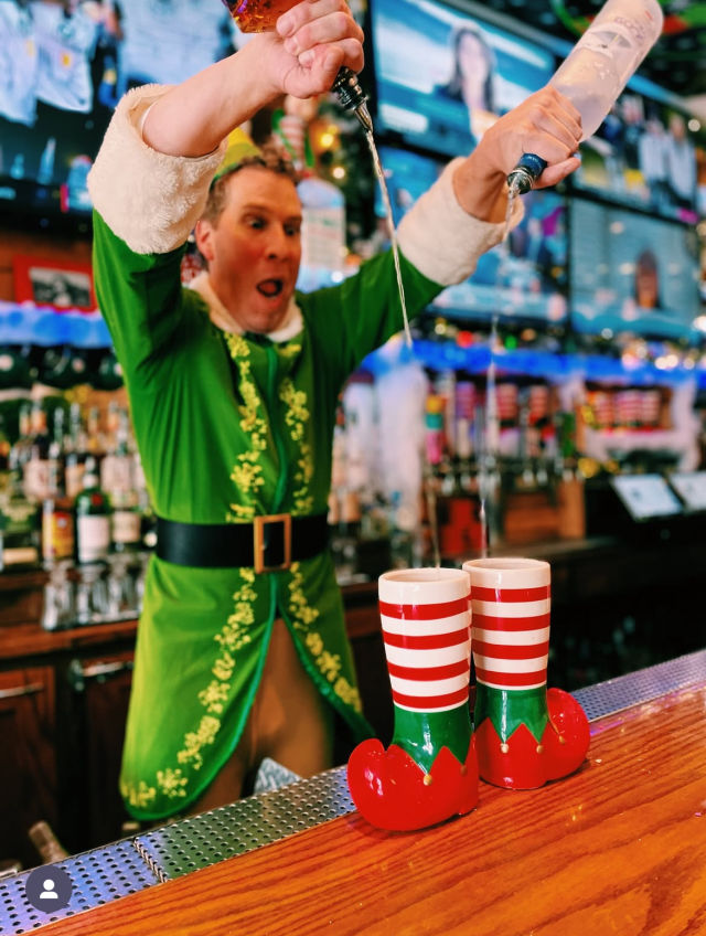 Signature cocktails like the Son of a Nutcracker, Yule Mule, and Naughty or Spice are fan favorites. Beer lovers can go big with a 36-ounce Elf Boot.