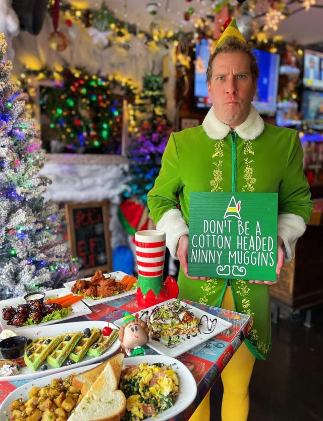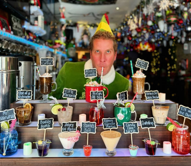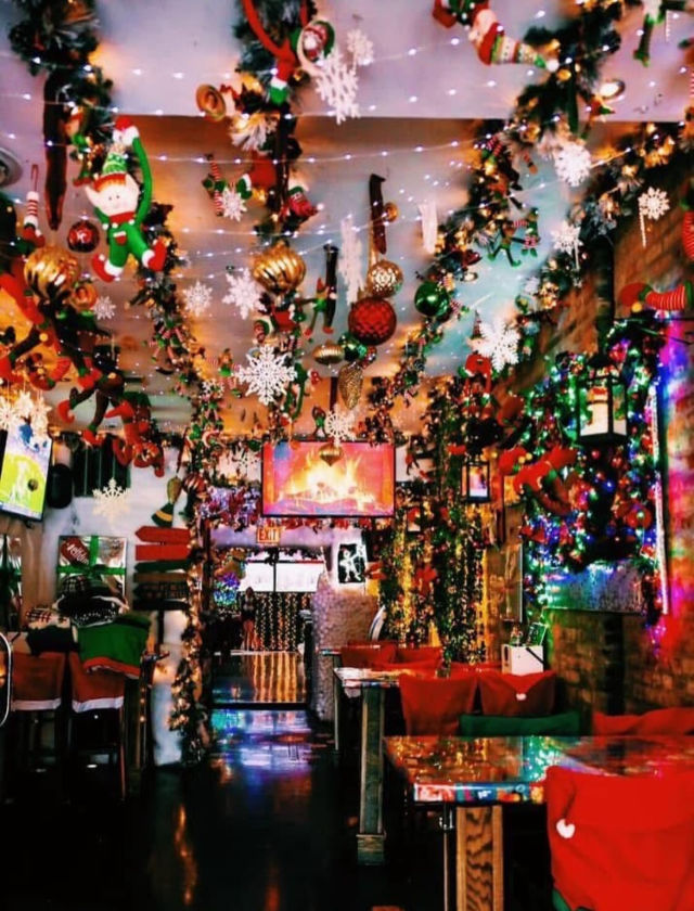 Think cozy Christmas chaos in the best possible way. Expect walls covered in elves, glowing lights, festive music, and a playful crowd that loves to laugh (and quote Elf).
