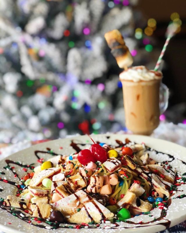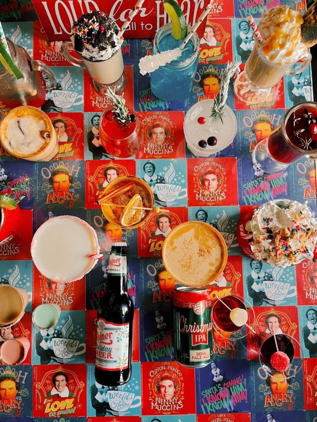The Elf’d Up menu fully commits to the theme. Try Buddy’s Breakfast Pasta, spaghetti topped with maple syrup, chocolate fudge, and mini marshmallows (and yes, it’s actually good). Other favorites include Papa Elf’s Mac & Cheese, Arctic Puffin’s Fish Tacos, and the Buddy Burger, served with crispy onion strings and avocado.