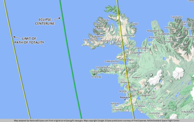 Western Iceland, especially the Snæfellsnes Peninsula, the Reykjanes Peninsula, or the Westfjords. Near Breiðafjörður Bay is where totality will last the longest.