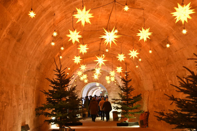 For a quiet moment, visitors can slip underground into the sandstone vaults where candles flicker on the walls and choirs perform among the arches. This sheltered area—part of the market’s “Kasemattenweihnacht”—creates a warm, intimate atmosphere that feels almost secret.