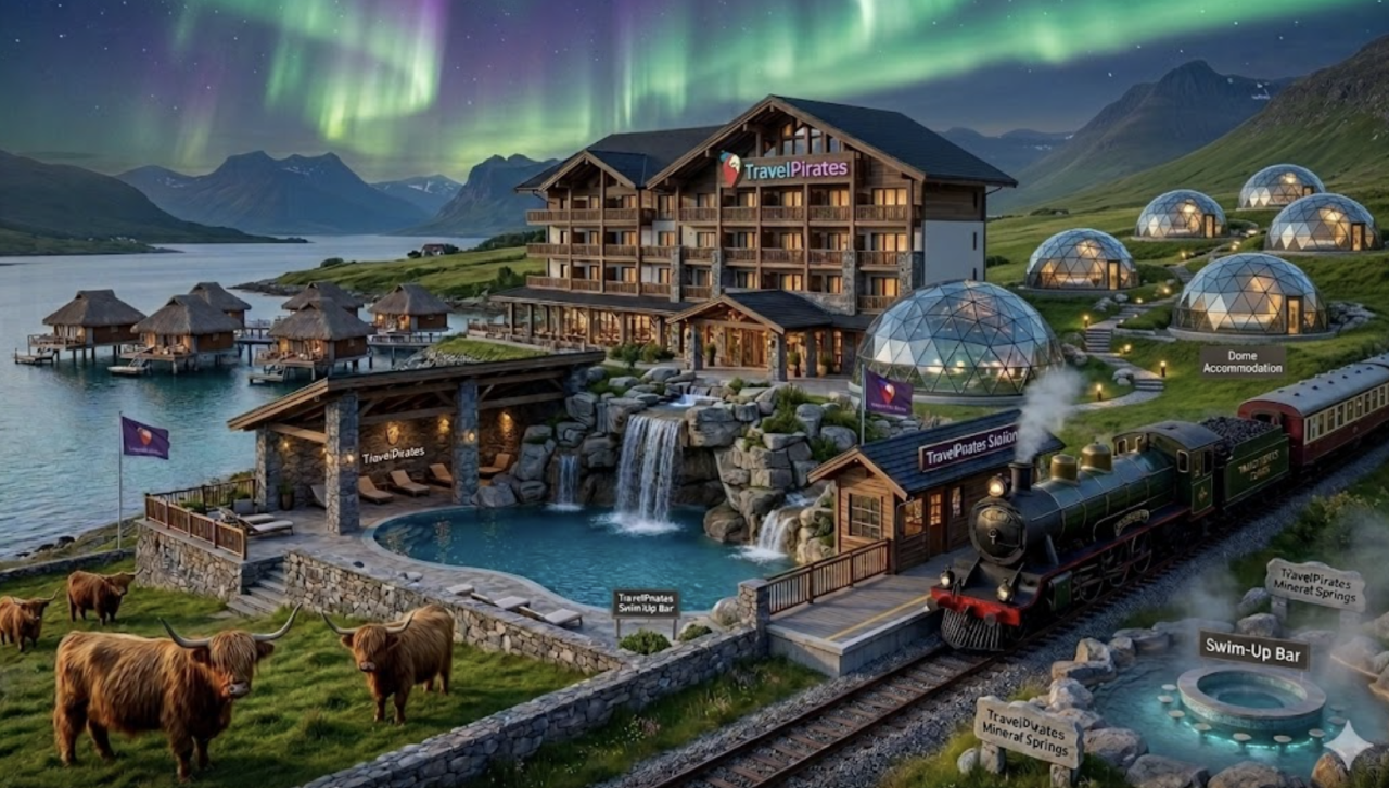 Introducing the World's First TravelPirates themed hotel! Coming Fall 2026, this hotel has everything our audience loves, filled with cave pools, hot springs, highland cows, northern lights viewing domes, and overwater bungalows! It's a total sensory overload that's sure to be fun for the whole family.