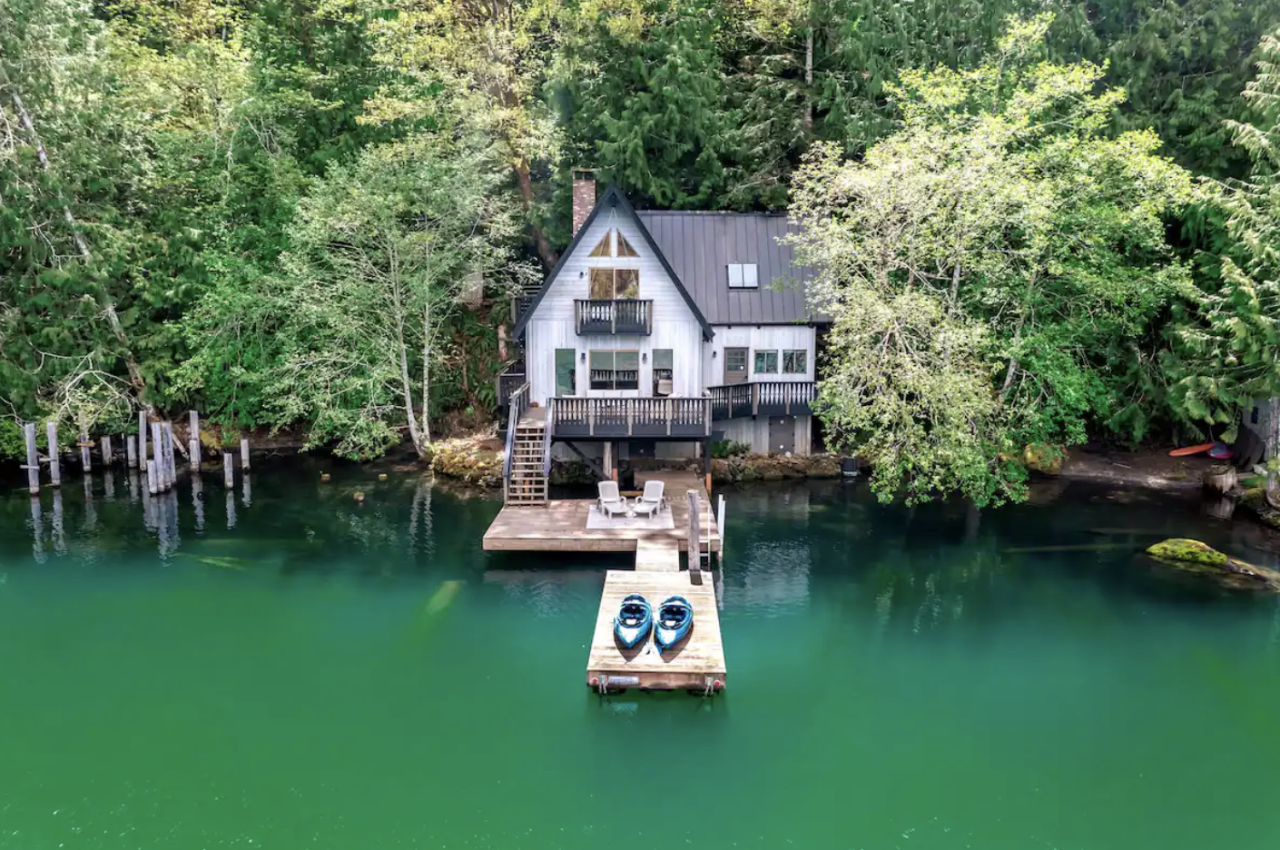The turquoise water outside this lakefront cabin in Port Angeles, Washington is absolutely mesmerizing, resembling Lake Louise or Emerald Lake in the Rocky Mountains of Canada. The cabin can fit up to six guests and offers three bedrooms. Guests have access to an outdoor fireplace, a dock, and two kayaks.