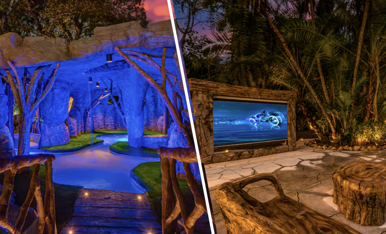 This Airbnb is located in a quiet neighborhood of Miami, Florida. The main attraction is its backyard, which features a grotto-covered hot tub, a koi fish and turtle pond, an outdoor cinema area, a regular pool, a pickleball court, and more. Inside, you'll be treated to a pool table, a foosball table, five bedrooms, and three bathrooms.