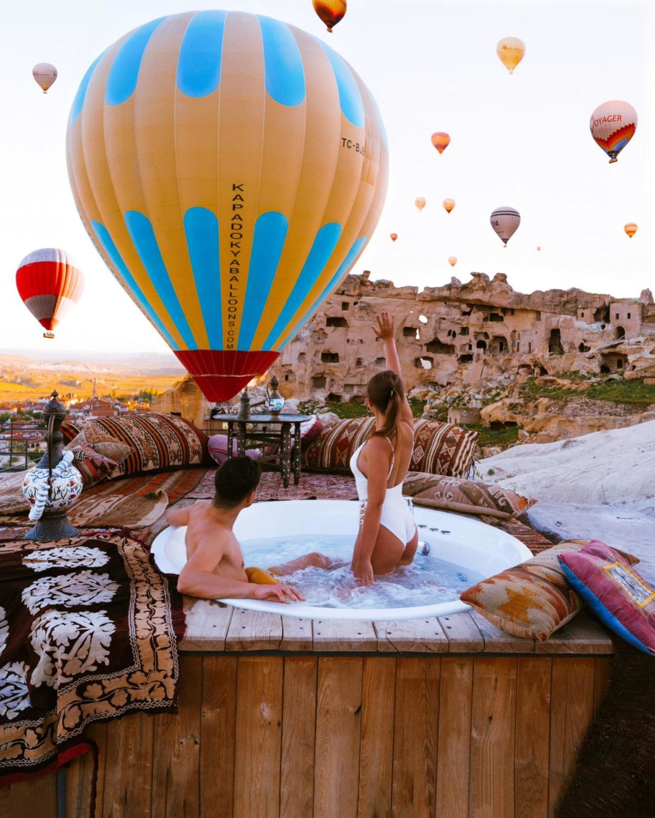 Located in a quieter, yet equally beautiful part of the Cappadocia region, this award-winning (5/5 on TripAdvisor and Travelers' Choice Award Winner) cave hotel offers multiple terraces to catch phenomenal views of the hot air balloons at sunrise. There's even a hot tub that you can soak in and watch the balloons from. We've found rates from $89 a night, and you'll get breakfast included in the rate. Also, tourist hot spot, Goreme is less than two miles away.