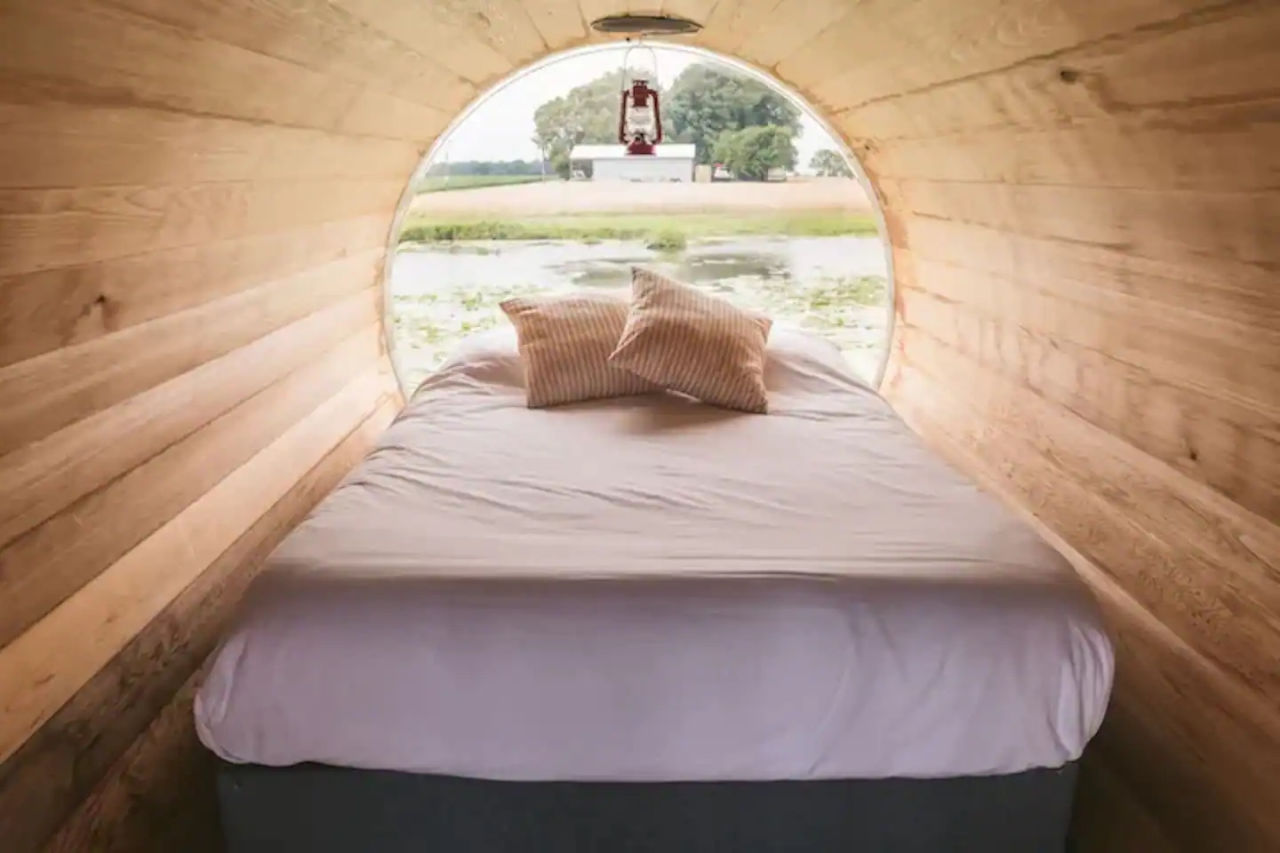 Starting from $101 a night, this red cedar wine barrel can accommodate two guests with a double bed. Guests have a stunning view of the harbor from their window inside the barrel or a breathtaking panoramic view when they step outside onto the floating deck.