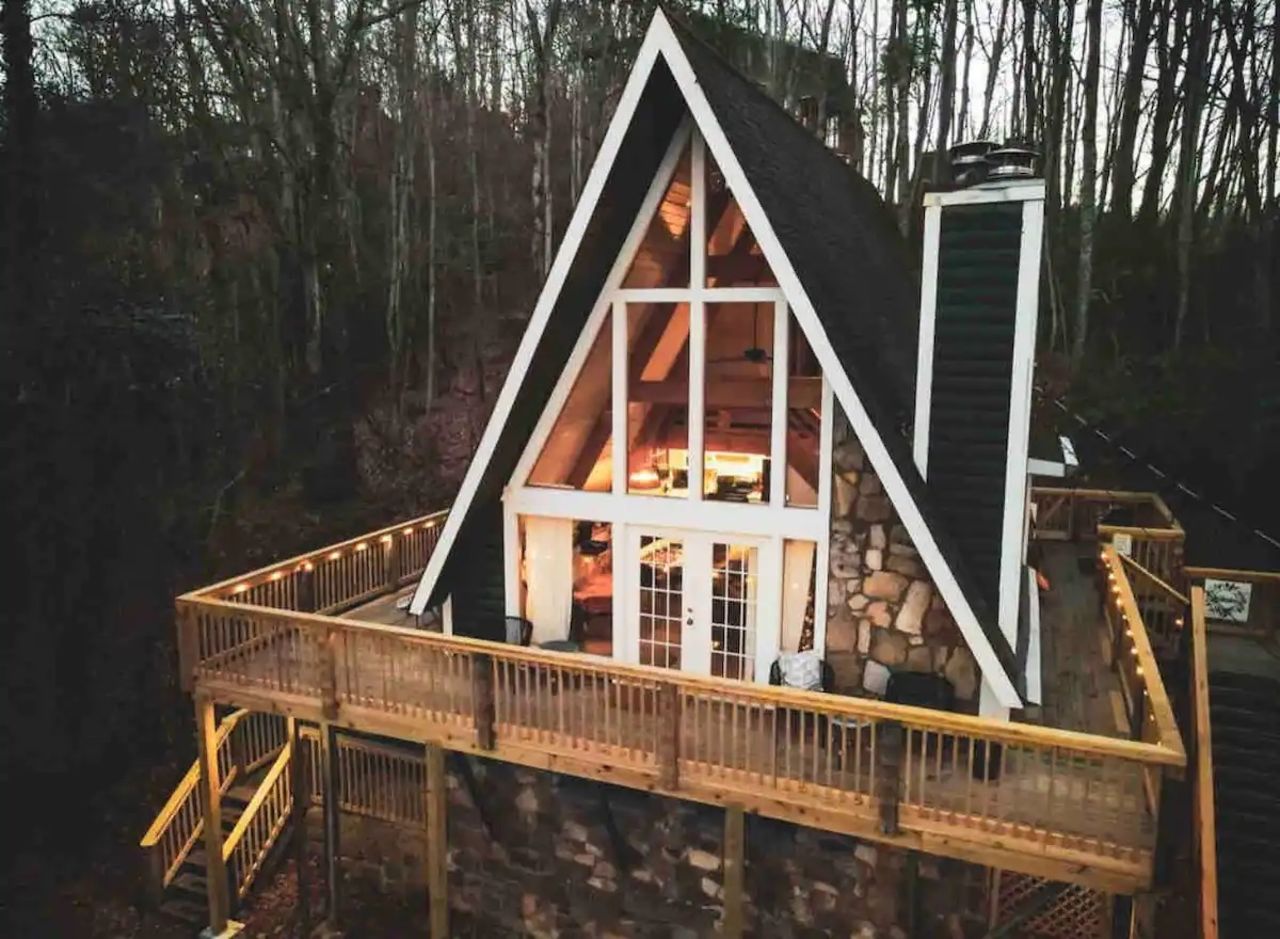 Escape to the Great Smoky Mountains and reconnect with the great outdoors in this stunning Airbnb. This A-frame cabin is set right in the heart of Smoky Mountains National Park in Gatlinburg, Tennessee. A perfect destination for hiking, skiing, and other great outdoor adventures. The best part is there's a jacuzzi on the deck overlooking the mountains.
