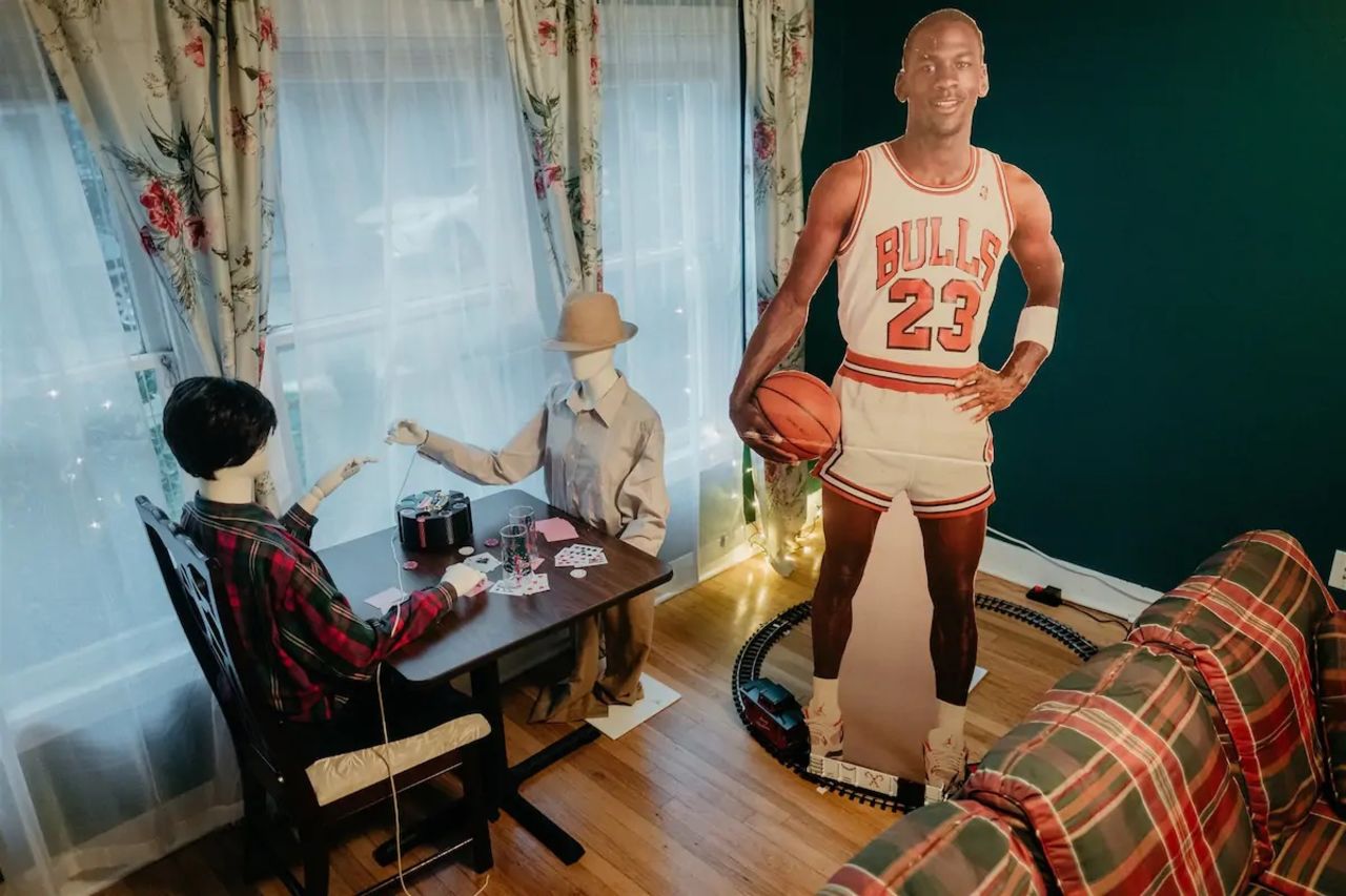 The living room takes you to one of Kevin's first plans to fend off the burglars, with the life-size Michael Jordan cut-out, the puppet mannequins you can move with string, and "Rocking Around the Christmas Tree" playing in the background.