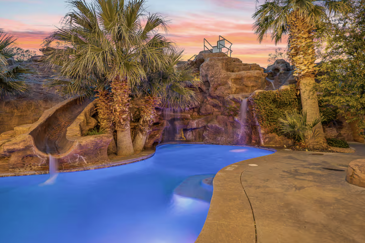 We’ve discovered the ultimate group getaway in southwest Utah! This stunning Airbnb accommodates up to 28 guests, featuring seven spacious bedrooms and six-and-a-half bathrooms. The true showstopper? A private pool oasis complete with a grotto cave, where a hidden hot tub awaits inside the cavern walls. For a splash of adventure, enjoy the twisting waterslide that winds around the rock formations and diving platforms perfect for making a big entrance into the pool. You'll also find a basketball and pickleball court, as well as, an indoor arcade with lots of games for the whole family.