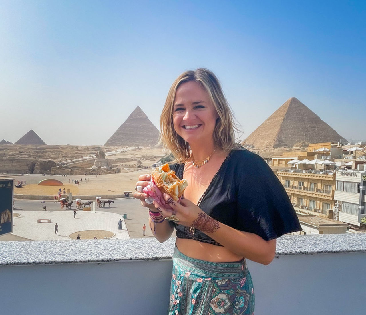 Tik Tok star and travel blogger Kimmie Connor traveled to the Pyramids and found that you can find a jaw-dropping view of the pyramids from the rooftop dining area of a nearby KFC and Pizza Hut.