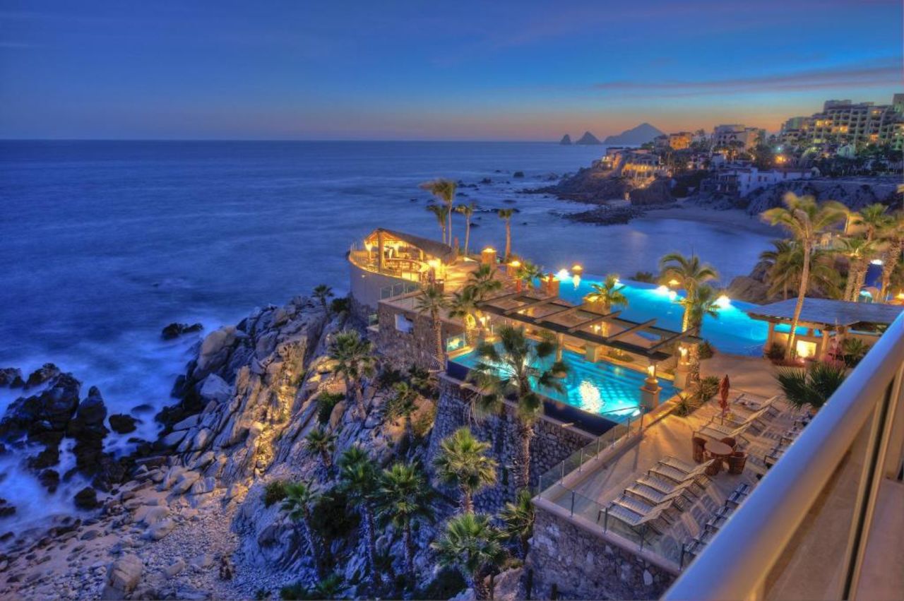 This cliffside resort has some of our favorite views in Cabo and features a private beach, an on-site restaurant, a bar & two outdoor swimming pools.